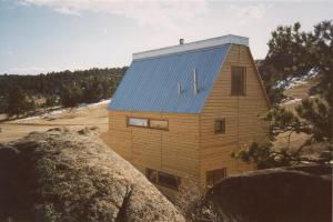 North east corner of house tucked up against protective rock outcrop. The bedroom on the ground floor has tall casement windows that open the room to an intimate space between rock and room.