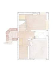 Ground floor plan with entry, bedroom, bath, horse's stall and laundry.