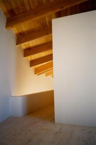 A wash of sunlight comes up into the bedroom from the gallery below.
