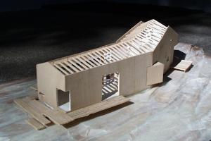Basswood study model shows the continuous rhythm of the exposed roof structure.